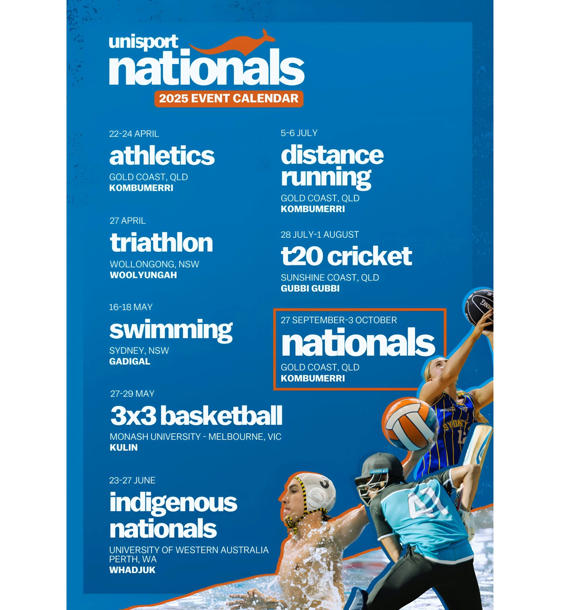 The UniSport Nationals features Div 1 and Div 2 competitions across various team and individual sports, including water polo, netball, football, taekwondo, kendo, and more. Standalone championships throughout the year cover swimming, athletics, surfing, triathlon, and others. ACU teams often travel regionally and interstate to compete against 41 Australian universities.